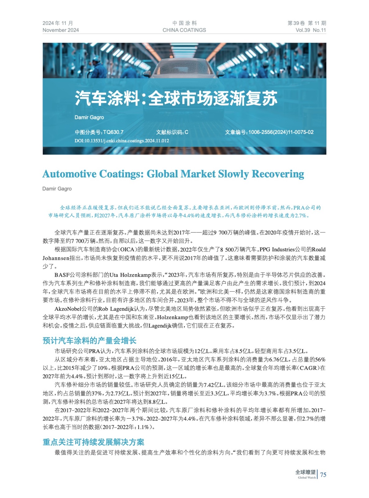 編者按:全球經濟正在緩慢復蘇,但我們還不能說已經全面復蘇。主要增長在亞洲,而歐洲則停滯不前。然而,PRA公司的市場研究人員預測,到2027年,汽車原廠涂料市場將以每年4.4%的速度增長,而汽車修補涂料的增長速度為2.7%。