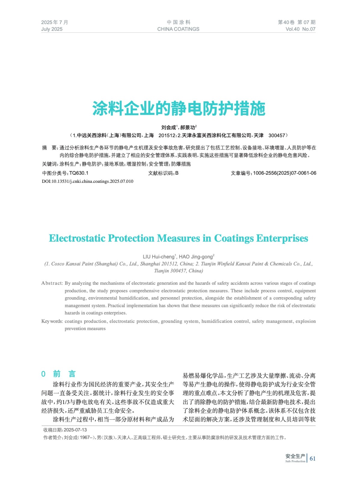 通過分析涂料生產各環節的靜電產生機理及安全事故危害,研究提出了包括工藝控制、設備接地、環境增濕、人員防護等在內的綜合靜電防護措施,并建立了相應的安全管理體系。實踐表明,實施這些措施可顯著降低涂料企業的靜電危害風險。