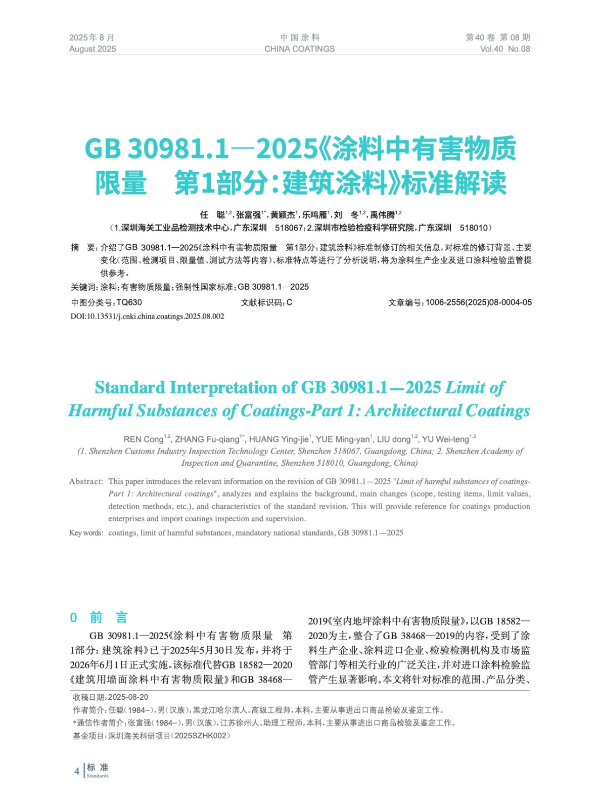 摘要:介紹了GB 30981.1—2025《涂料中有害物質(zhì)限量 第1部分:建筑涂料》標準制修訂的相關(guān)信息,對標準的修訂背景、主要變化(范圍、檢測項目、限量值、測試方法等內(nèi)容)、標準特點等進行了分析說明,將為涂料生產(chǎn)企業(yè)及進口涂料檢驗監(jiān)管提供參考。