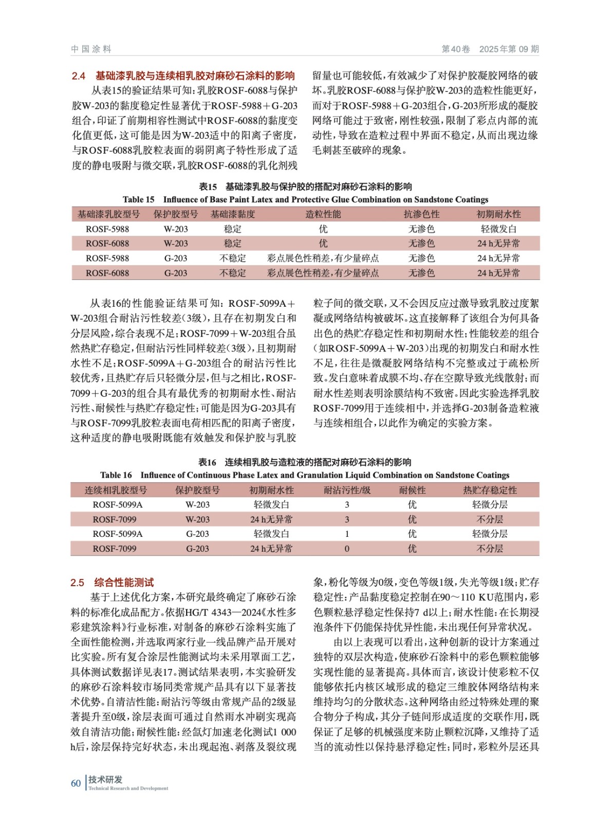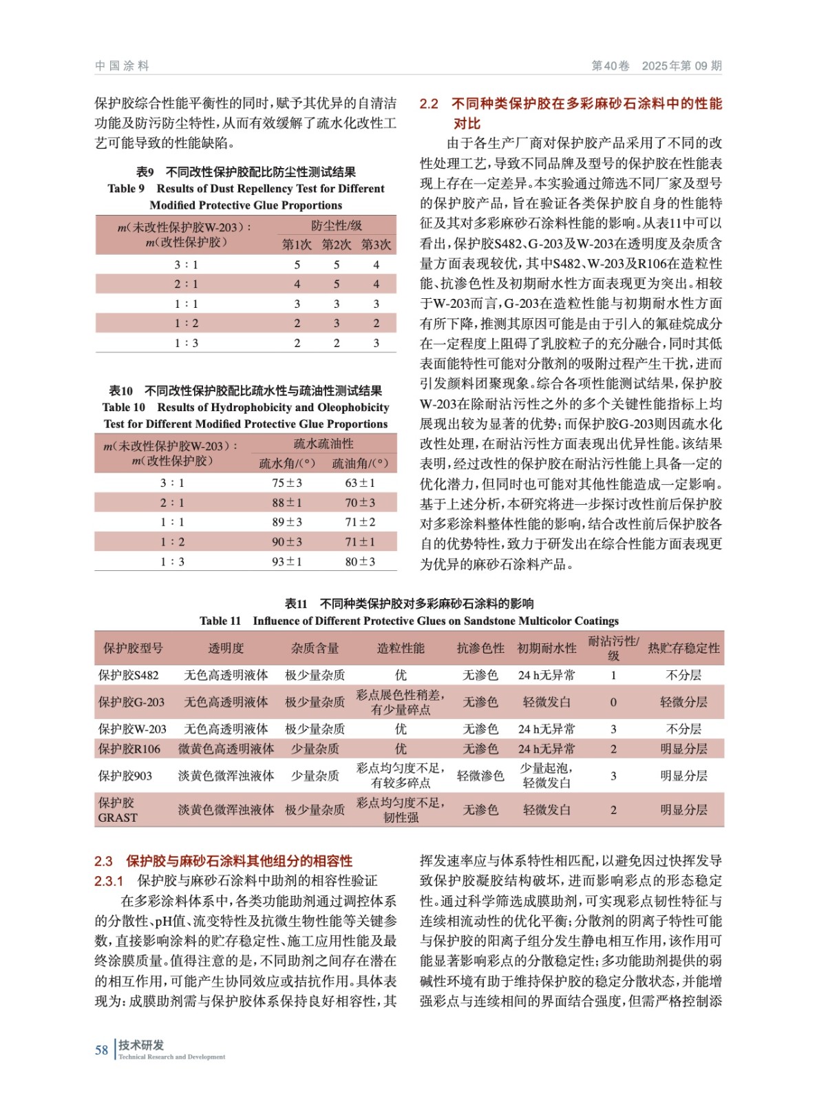摘要:通過保護膠改性、原材料選擇與配方優化,系統研究了其對多彩麻砂石涂料自清潔性能、初期耐水性、耐候性、熱貯存穩定性等性能的影響,制備了兼具自清潔功能與優異裝飾性能的多彩麻砂石涂料。結果表明,通過對保護膠的改性處理,可在改性后的保護膠中引入疏水基團,有效降低表面能,形成優異的疏水效果,但會對其原有的抗靜電及防塵功能產生一定影響;將未改性保護膠與氟化改性保護膠按質量比2∶1均勻混合后,能夠產生協同作用,在維持保護膠原有的抗靜電與防塵效果的同時,顯著增強其疏水/疏油性能;在基礎漆中,純丙乳膠ROSF-6088與保護膠W-203的組合表現更為優越,在連續相與造粒液中,硅丙乳膠ROSF-7099與多功能保護膠G-203的組合在初期耐水性、耐沾污性、耐候性以及熱貯存穩定性方面均展現出最優性能。基于以上保護膠與乳膠組合所開發的高性能麻砂石涂料,其在自清潔能力、耐沾污性及耐候性等方面表現突出,同時兼具良好的施工適應性與經濟適用性,該研究成果為高性能自清潔外墻涂料的開發提供了創新性技術路徑。