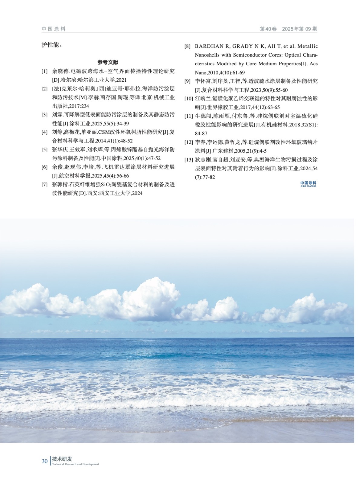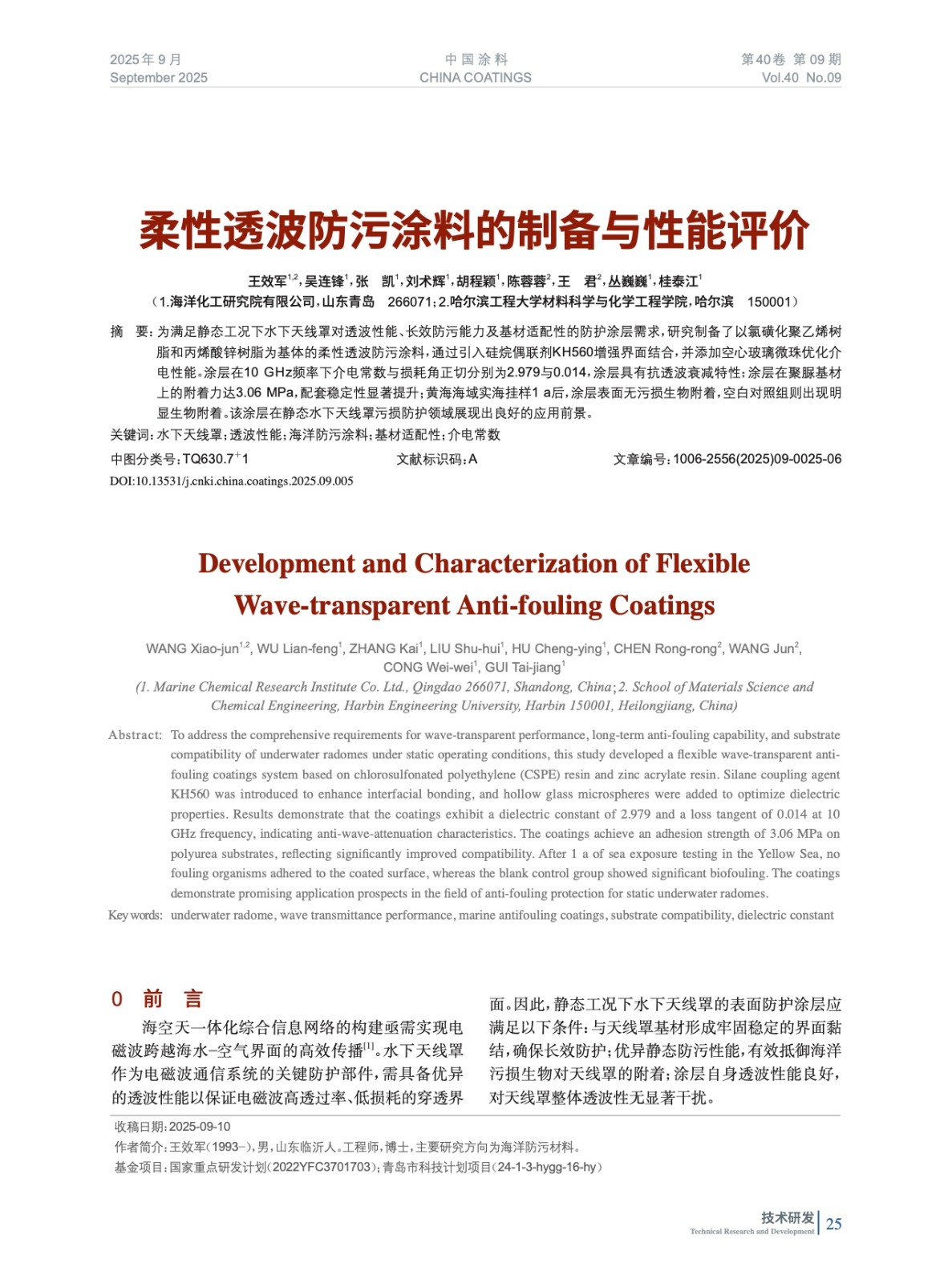 摘要:為滿足靜態(tài)工況下水下天線罩對(duì)透波性能、長(zhǎng)效防污能力及基材適配性的防護(hù)涂層需求,研究制備了以氯磺化聚乙烯樹(shù)脂和丙烯酸鋅樹(shù)脂為基體的柔性透波防污涂料,通過(guò)引入硅烷偶聯(lián)劑KH560增強(qiáng)界面結(jié)合,并添加空心玻璃微珠優(yōu)化介電性能。涂層在10 GHz頻率下介電常數(shù)與損耗角正切分別為2.979與0.014,涂層具有抗透波衰減特性;涂層在聚脲基材上的附著力達(dá)3.06 MPa,配套穩(wěn)定性顯著提升;黃海海域?qū)嵑鞓? a后,涂層表面無(wú)污損生物附著,空白對(duì)照組則出現(xiàn)明顯生物附著。該涂層在靜態(tài)水下天線罩污損防護(hù)領(lǐng)域展現(xiàn)出良好的應(yīng)用前景。