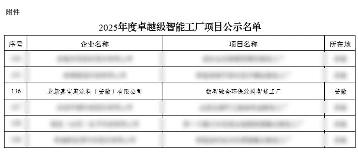 近日,工信部正式公示了2025年度卓越級智能工廠項目名單。經過多輪嚴格評審,北新嘉寶莉涂料(安徽)有限公司打造的“數智融合環保涂料智能工廠”成功入選,榮獲國家級智能制造領域的重要認可,國家級名片再+1!