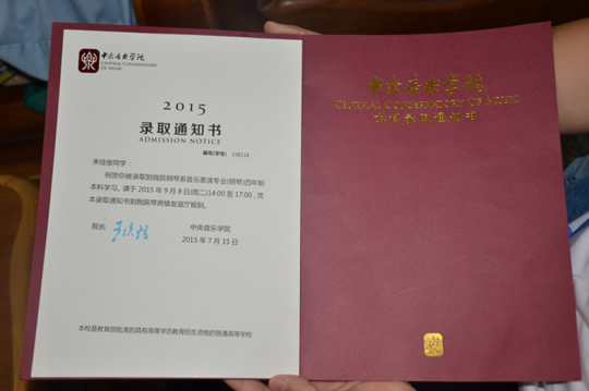 圖1:來佳俊被中央音樂學(xué)院錄取