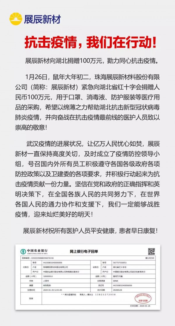 展辰新材向湖北捐贈100萬元,戮力同心抗擊疫情!