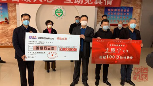2月6日上午,在龍口市行政中心捐贈儀式現場,道恩集團向龍口市慈善總會捐贈300萬元現金,道恩集團董事長于曉寧個人捐獻100萬元防疫物資。