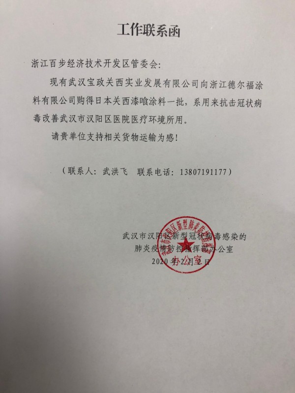 2月2日浙江德爾福涂料收到其湖北參股公司武漢寶政關西實業發展有限公司的緊急請求,急需采購進口日本關西品牌抗冠狀病毒涂料一批,用于改善漢陽區醫療環境。