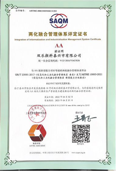 近日,雙樂顏料股份有限公司、雙樂顏料泰興市有限公司榮獲兩化融合管理體系評(píng)定證書,是興化市、泰興市第一批兩化融合管理體系2.0版貫標(biāo)并獲得AA認(rèn)定的企業(yè)。