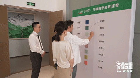 但想要成為一名合格的“粉刷匠”,需要經(jīng)過多重考驗。三棵樹乳膠漆產(chǎn)品有多達(dá)1800種顏色,從選色到命名都融入了中國傳統(tǒng)色彩文化的深厚底蘊(yùn)。在體驗“辨色”的過程中,武大靖最為傾心的“云霓翠”,也是三棵樹“國漆國色”主推色之一。
