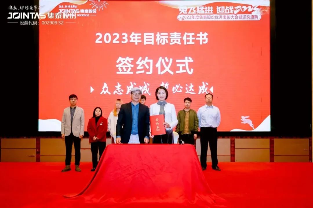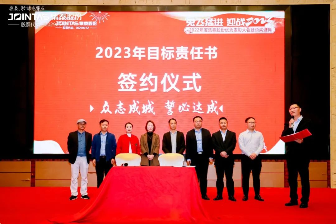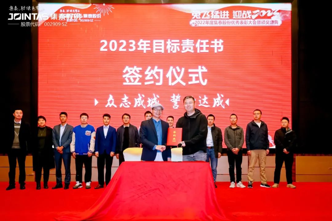 現(xiàn)場還舉行了2023年銷售目標責任書簽約儀式,集泰股份總經(jīng)理鄒珍凡與各線條總、渠道總簽訂了2023年銷售目標責任書。儀式上,集泰人宣讀目標、誓必達成的口號震聾發(fā)聵,飽含力量!